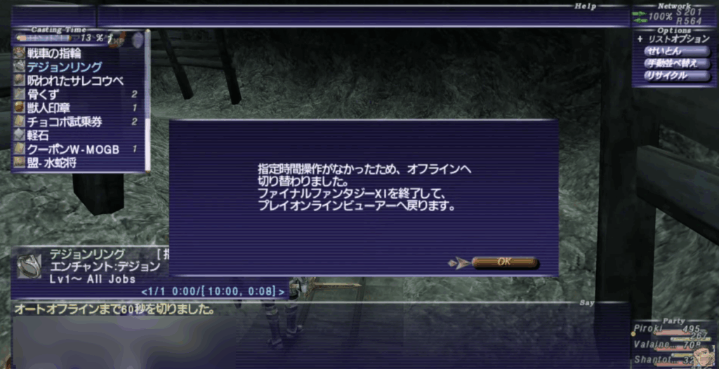 なぜか、操作していても初期設定ではこのオートオフライン機能が勝手にゲームを終了させてきます・・・。詳しい設定変更方法は別のブログで紹介しますが、メニュー>コンフィグ>グローバルの「通信制御」 のオートオフラインを「オフ」にするとこのようなバグを回避できます。