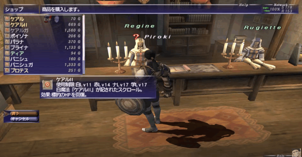 レベル上げ中に「ケアルがあればもっと戦えるのに!」という場面が多々あったので、サンドリア港にある魔法屋さんに回復魔法を買いに行きます。FF11では魔法は魔法屋さんなどで買ったり、モンスターが落としたスクロールを使うことで覚えていくという仕組みのようです。