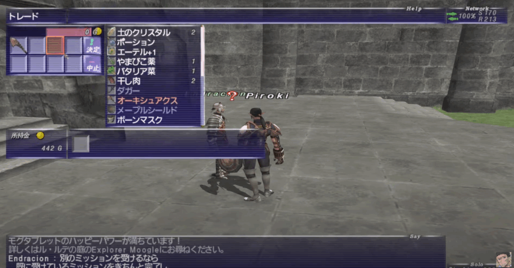 赤魔道士は命中が微妙なので、「バトルグローブ」という両手装備を買ってDEXと命中をあげたほうが良いとのアドバイスをもらい、早速競売所を覗いてみます。