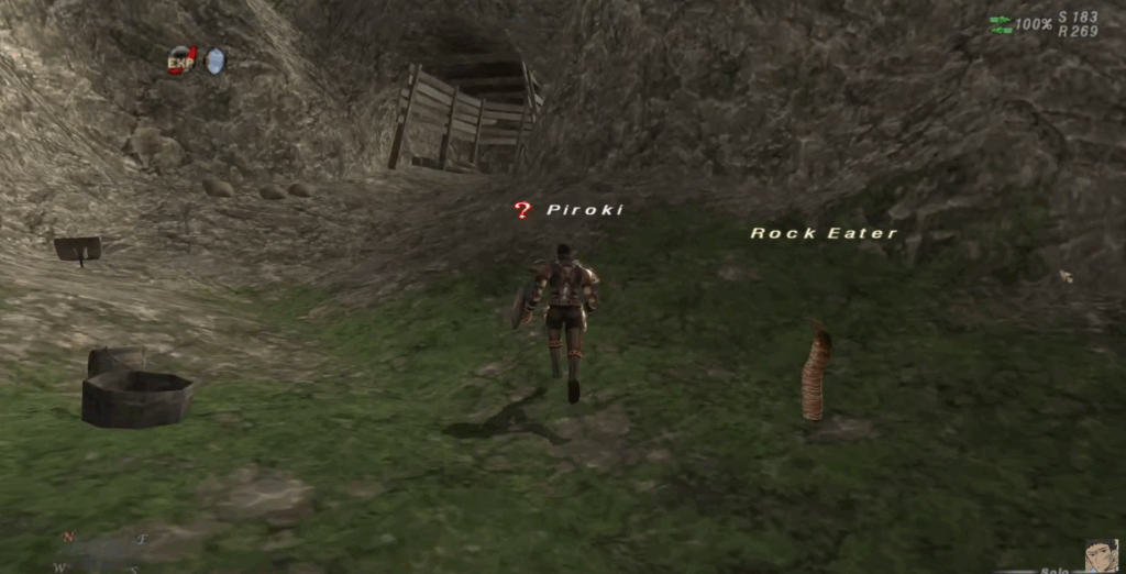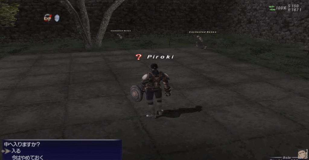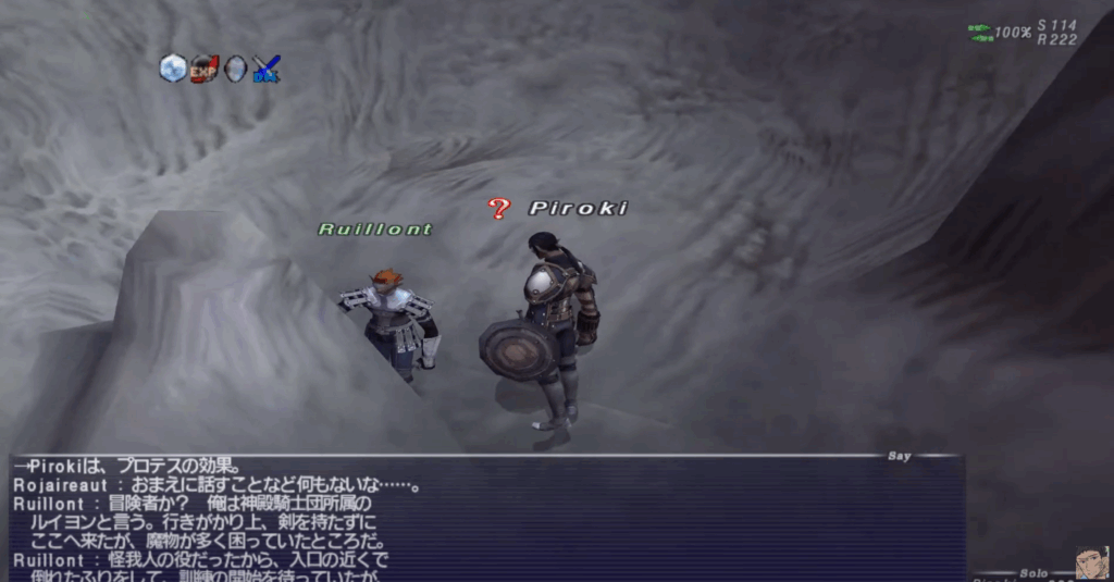 洞窟に入ってすぐの水辺の近く(H-3)にいる怪我人役の新兵「Ruiiiont」に話しかけます。