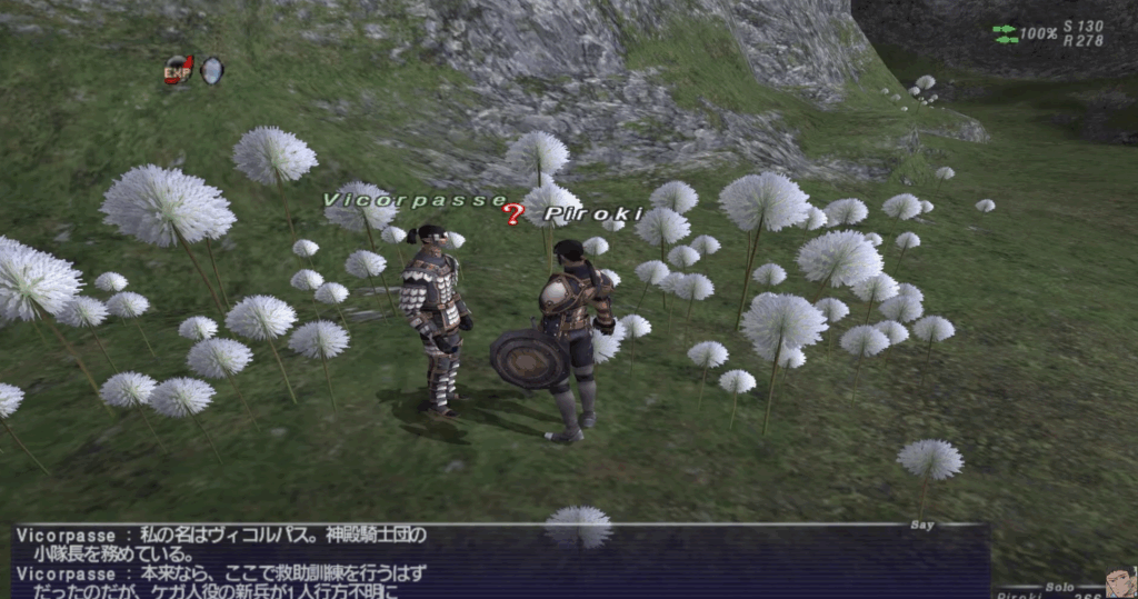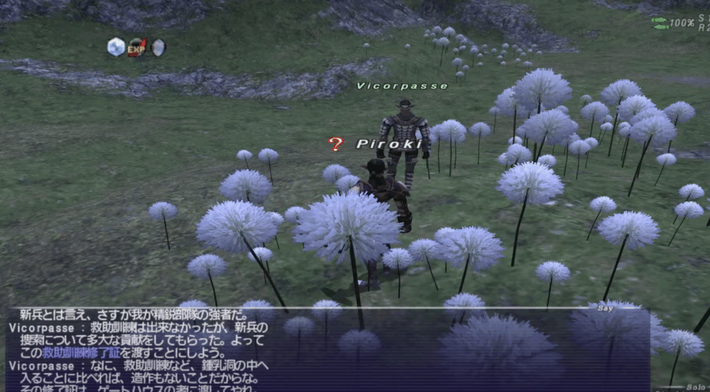 ラテーヌ高原の谷底(F-6)にいる救助訓練を指揮している小隊長「Vicorpasse」に話しかけると、どうやら救助訓練中に怪我人役の新兵が行方不明になったようで、探すのを手伝うことになりました。