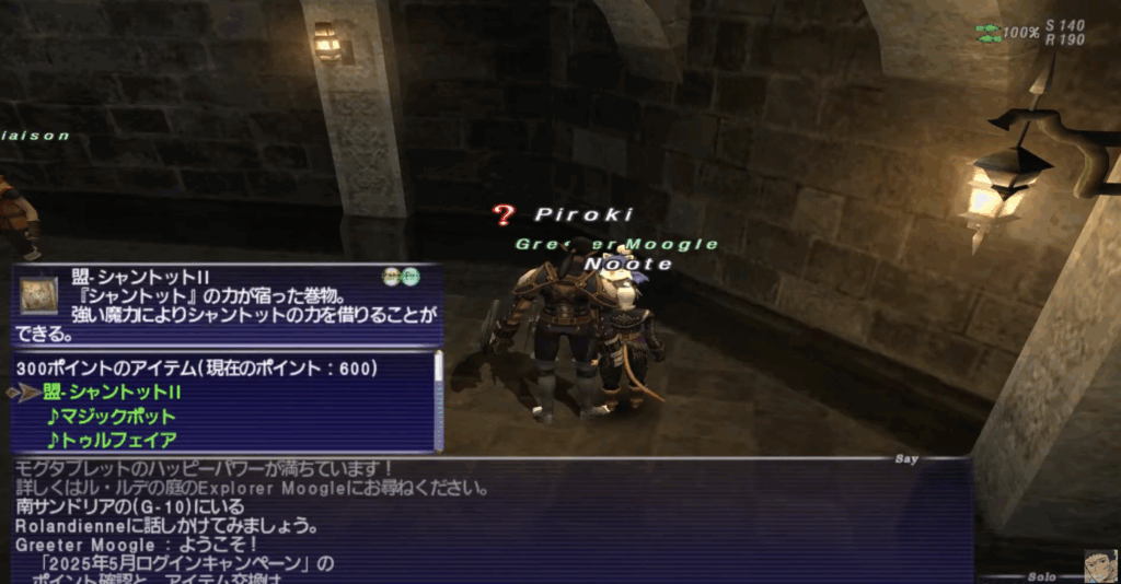 早速、ミネンス・レコードのチュートリアルクエストのフェイス関連の目標を達成(南サンドリアL-6の「Gondebaud」)して序盤のレベル上げで大活躍してくれる盾役フェイスの「ヴァレンラール」を覚えたり、先ほどログインボーナスでもらったけど使い方がわからなかった超絶火力を出してくれるフェイス「シャントットⅡ」を覚えることができました。これで戦力大幅アップ!!!