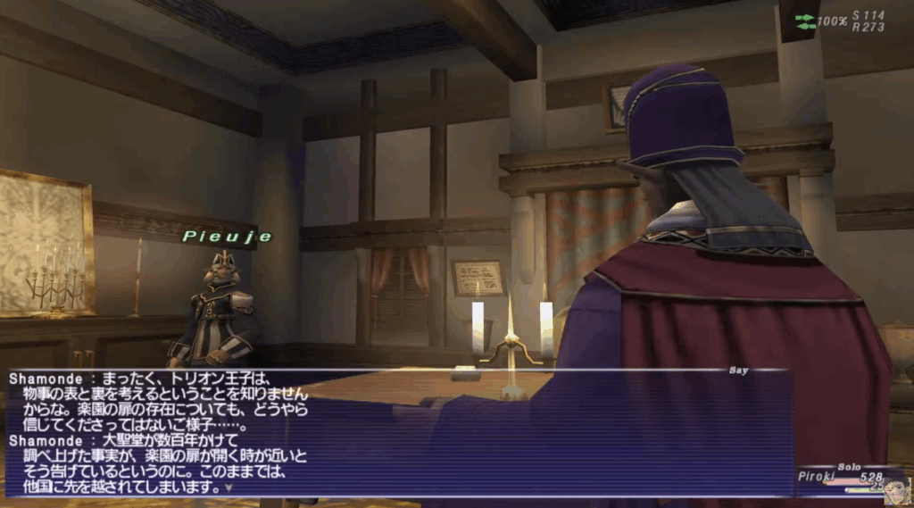 そして、調査方向所を大聖堂の2階にいるピエージュに渡しに行きます。すると、楽園の扉を探していて「開く日が近い?」という話をたまたま聞いてしまいます。