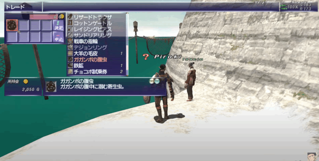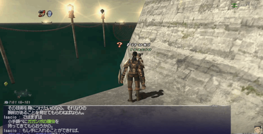 先ほど行ったセルビナのG-10にいる「Isacio」に話しかけて、クエストを開始。まずは小手調べに「ガガンボの腹中」を手に入れてこいと言われます。