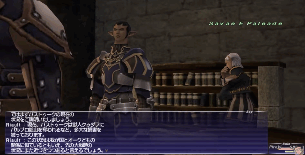 FF11の生誕23周年に、幼き頃にクリアできなかった悔しい思いを胸に再びヴァナ・ディールの地に降たった。ぴろきはチュートリアル後、何をしたら良いのかわからない状態になる。しかし、あらかじめ用意していた400円で買った中古本に助けられ、何とかサンドリアミッションを進めることに成功する。そして、初のBF戦を突破し「サンドリアランク2」になった。