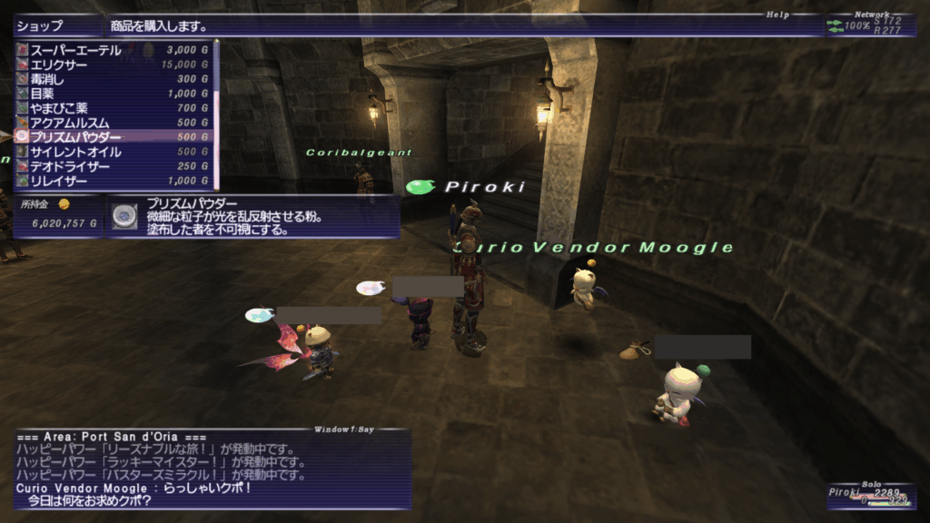 三国にいる「Curio Vendor Moogle」、通称星唄ショップ(サンドリア港のJ-9)で「スニーク」効果のある「サイレントオイル」と「インビジ」効果のある「プリズムパウダー」を買う事ができます。