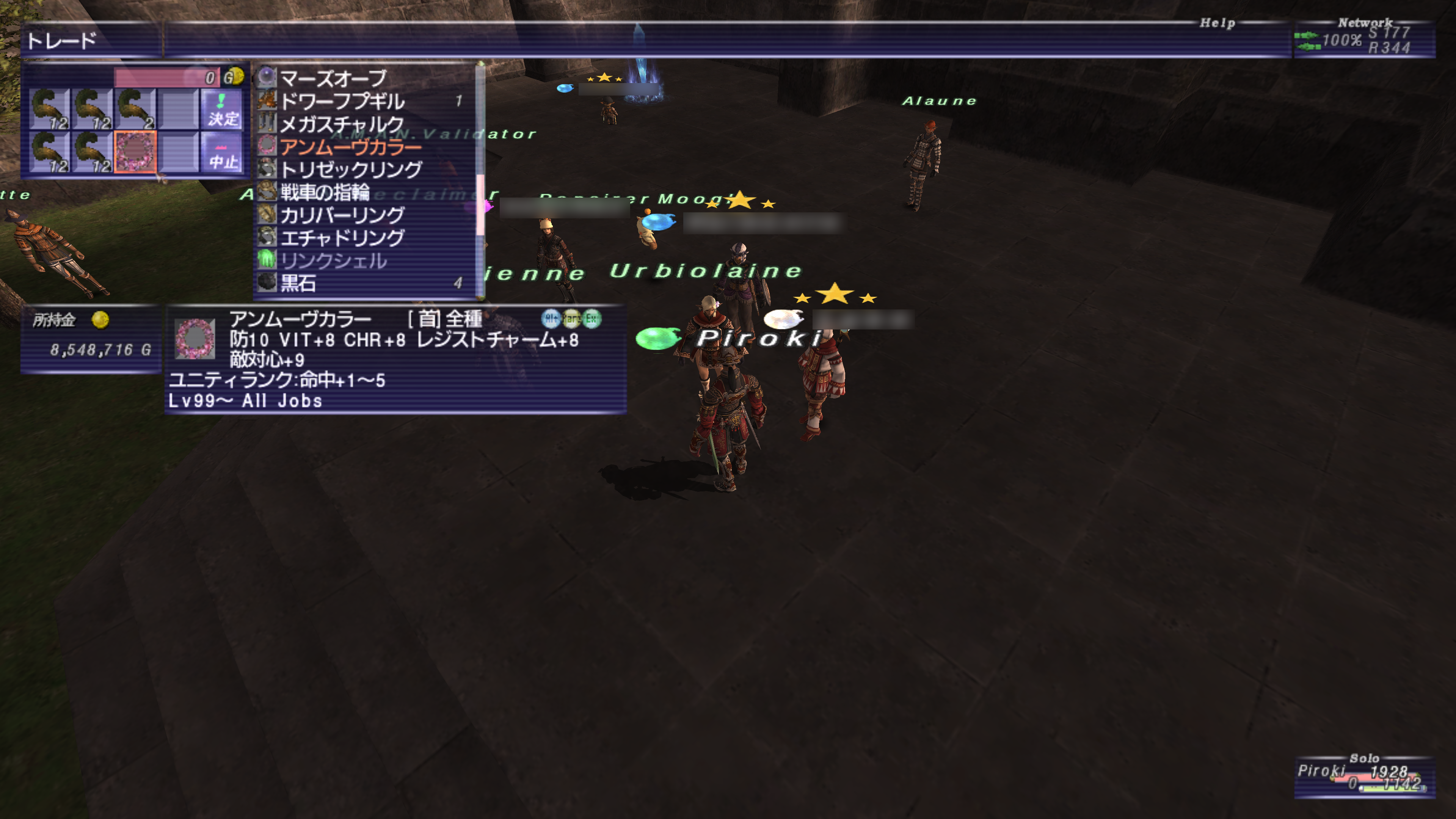 南サンドリアのG-10にいる「Urbiolaine」などのユニティ担当NPCに話しかけて、装備品と強化アイテム50個をトレードします。すると強化コストとしてユニティポイントを最大10,000ポイントを支払うことになります。