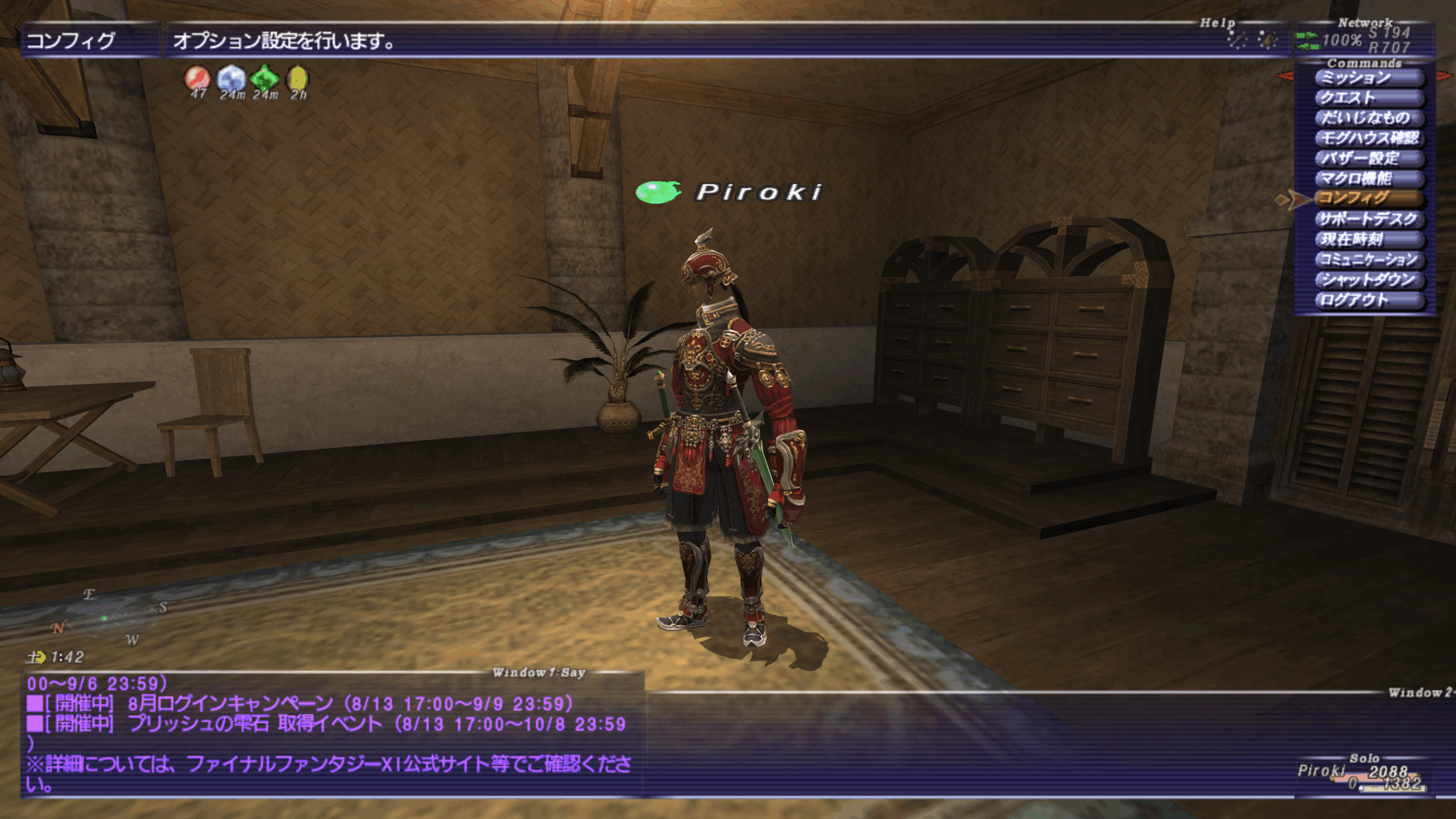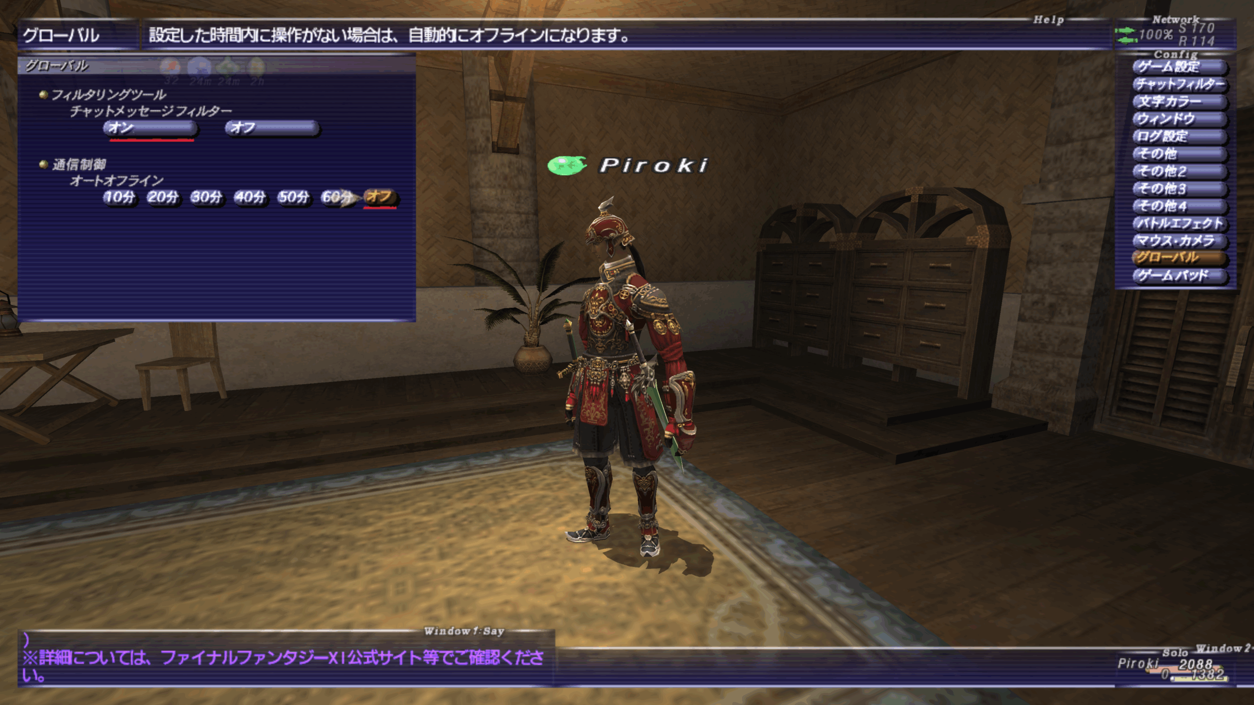 FF11の初期設定では「オートオフライン」がオン状態になっています。公式設定では20分間何も操作しなかったら強制的にログアウトさせるシステムとなっているのですが、なぜか操作していてもオートオフラインが発動してしまうことがあります。(配信中に2回ほどありましたw